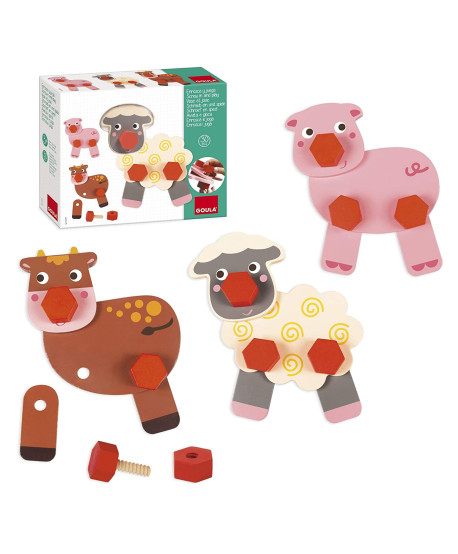 O jogo Goula Enrosca e Joga - Animais da Quinta aprende a enroscar de uma maneira divertida e simples. Cria pequenos animais divertidos torcendo as diferentes peças por seus parafusos hexagonais facilita a função de parafusar e desaparafusar manualmente. Desenvolver habilidades manuais e coordenação olho / mão.